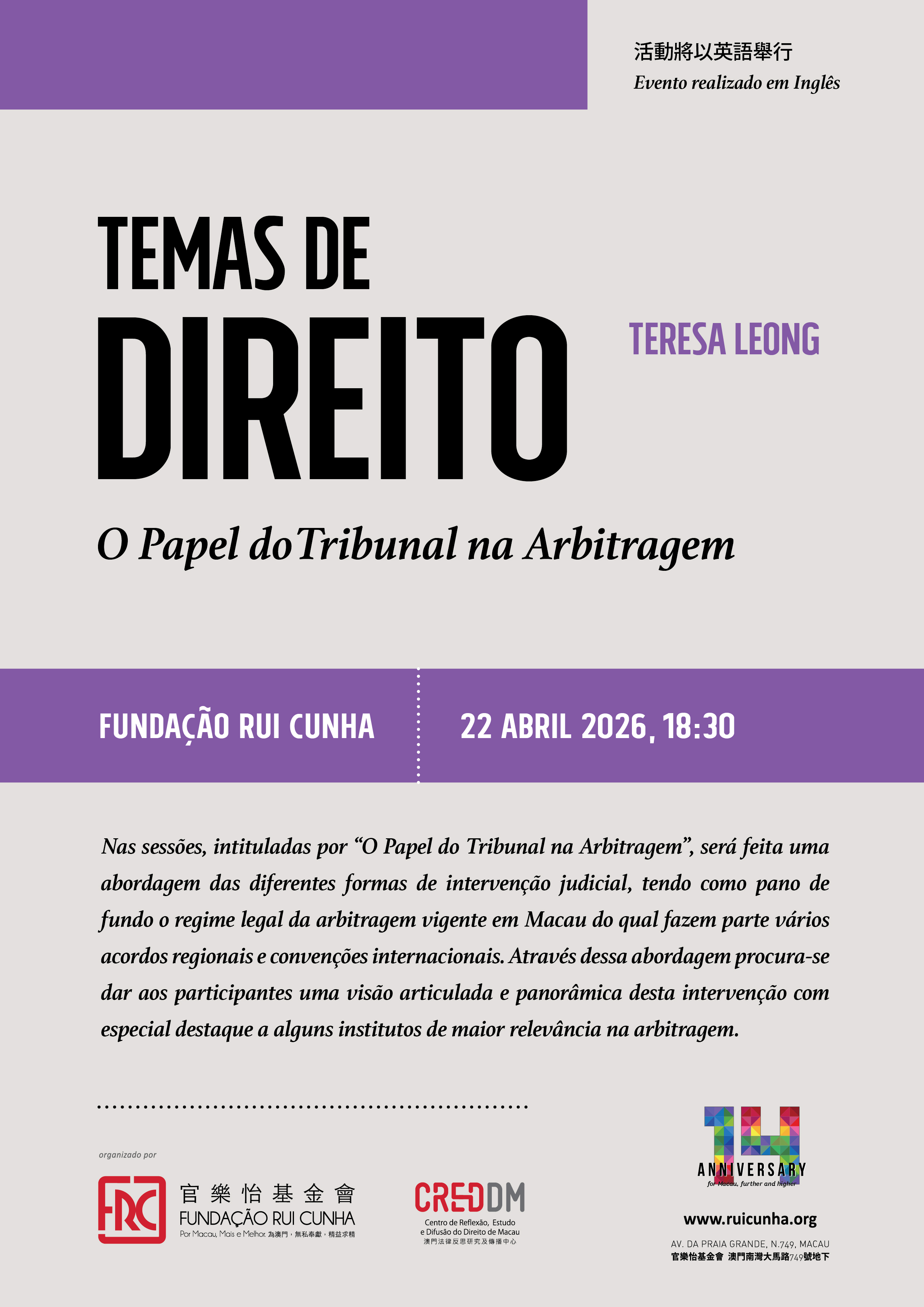 Nesta sessão será feita uma abordagem das diferentes formas de intervenção judicial, tendo como pano de fundo o regime legal da arbitragem vigente em Macau, do qual fazem parte vários convenções internacionais e acordos regionais. Através dessa abordagem, os participantes vão poder ter uma visão articulada e panorâmica desta intervenção, com especial destaque para um princípio de relevância na arbitragem: a competência-competência (princípio legal que estabelece a autoridade do Tribunal para decidir sobre a sua jurisdição).