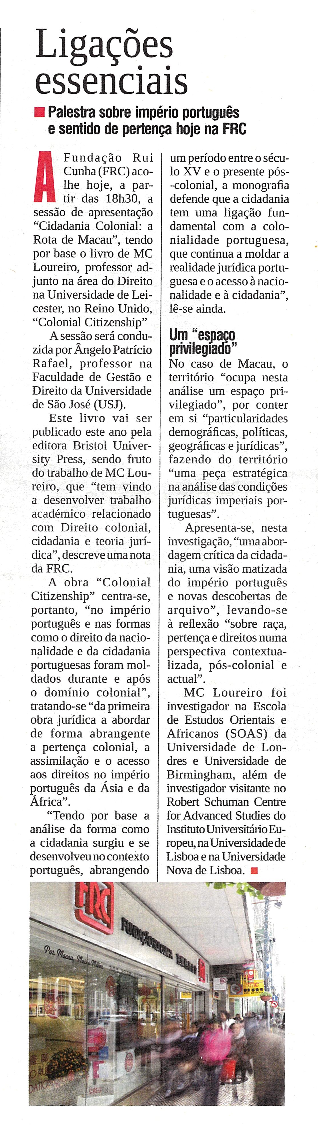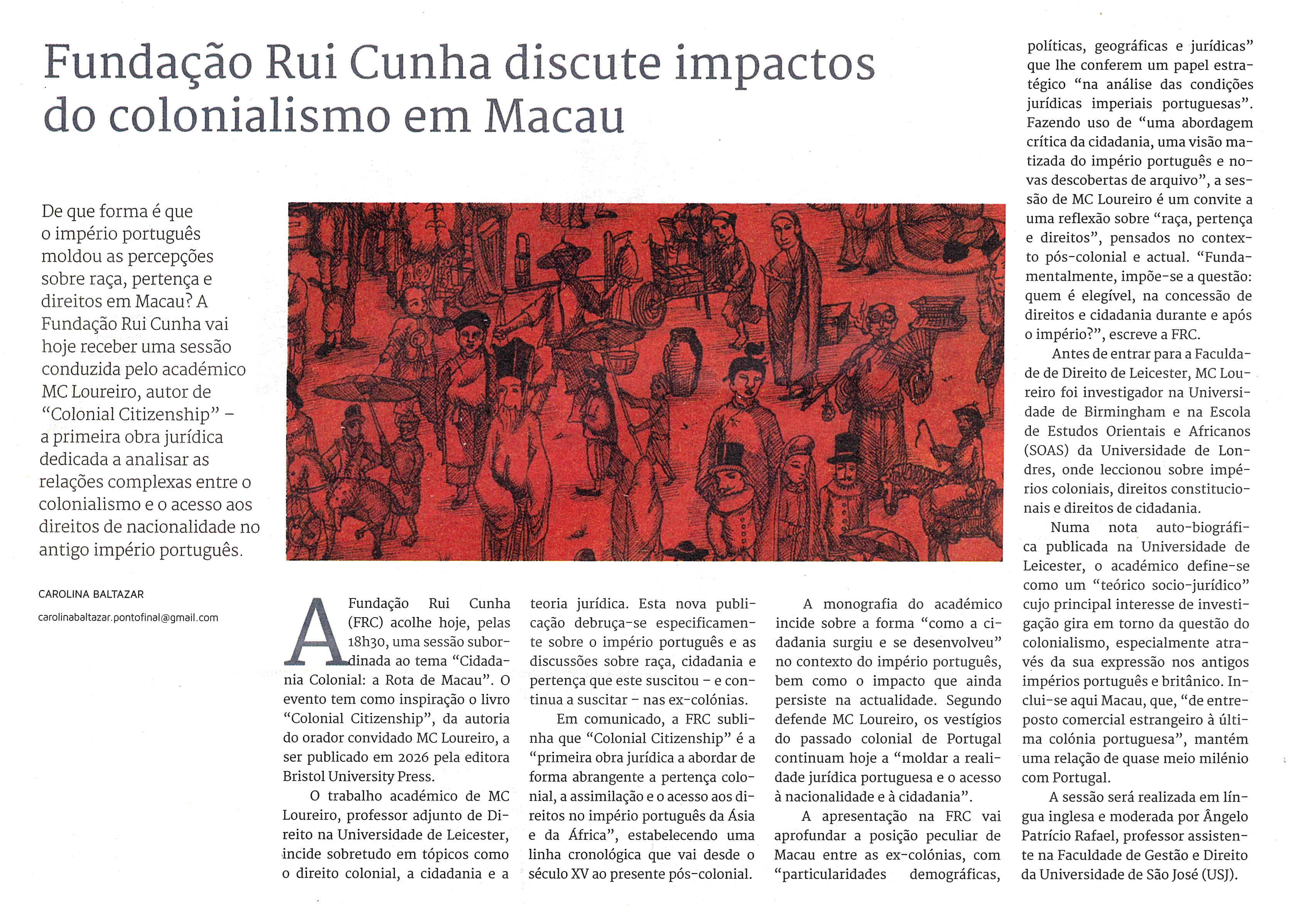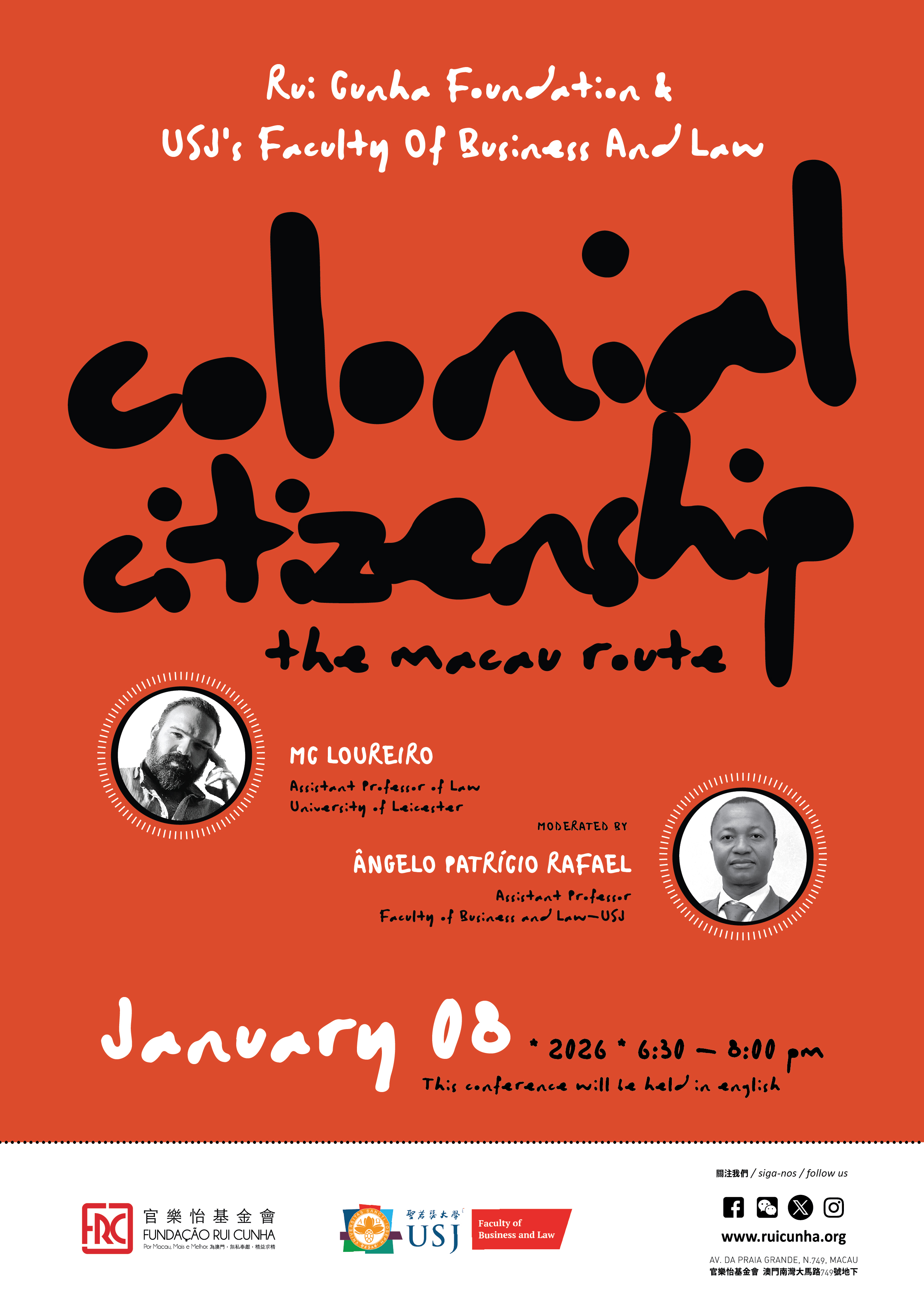 A Fundação Rui Cunha acolhe na quinta-feira, dia 8 de Janeiro pelas 18:30, a apresentação do tema “Colonial Citizenship: The Macau Route”, com base no livro “Colonial Citizenship” de MC Loureiro, Professor Adjunto de Direito na Universidade de Leicester, no Reino Unido, o qual será publicado em 2026 pela editora Bristol University Press.