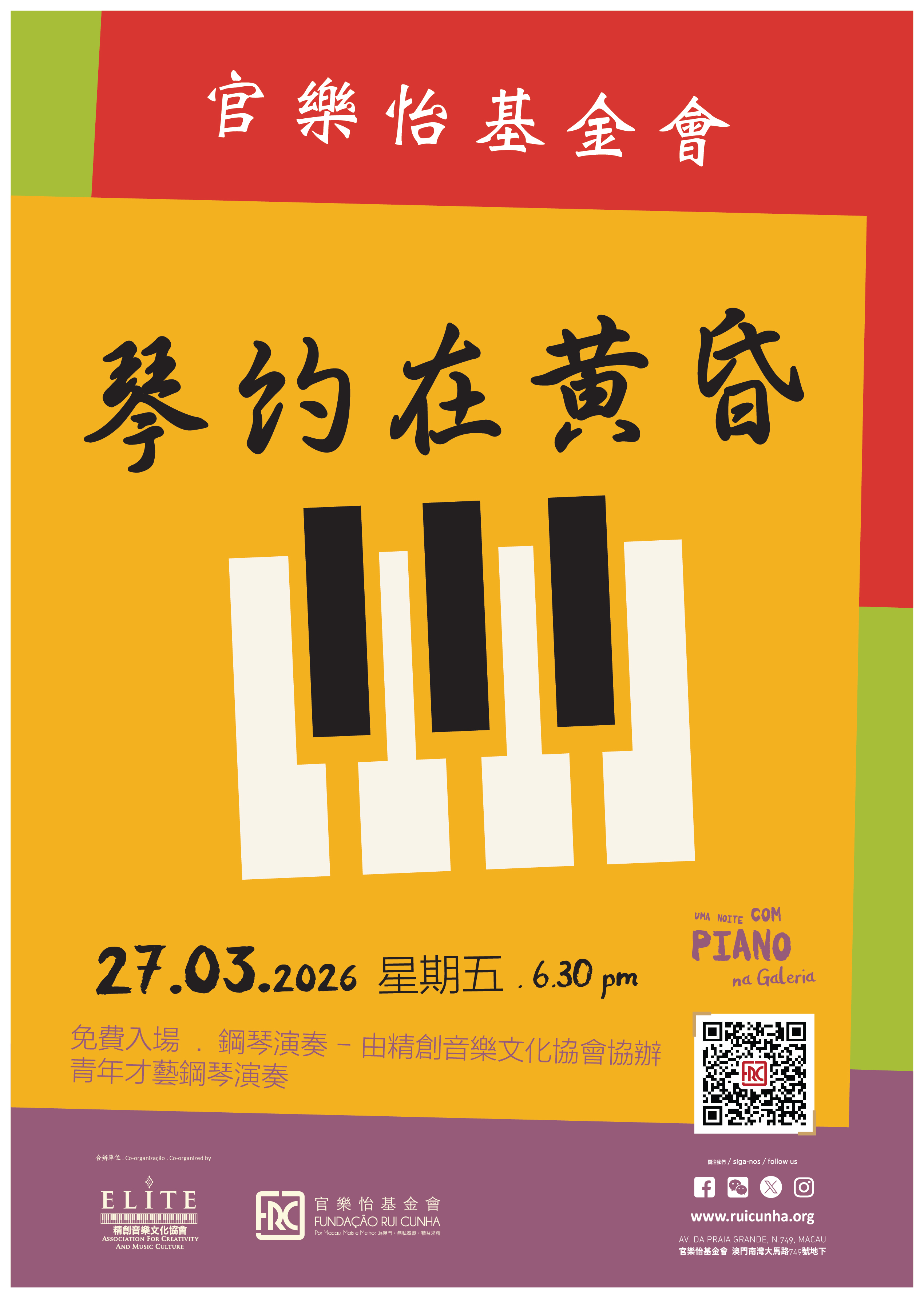 琴約在黃昏 – 2026.03.27 活動/發佈會/演講會 No Comment 鋼琴演奏 . 精創音樂文化協會 琴約在黃昏 由官樂怡基金會和精創音樂文化協會協辦之的周五青年才藝鋼琴演奏 今年每月兩次再次啟動。 官樂怡基金會畫廊在二零二四年重新啟動這項音樂活動,讓各個年齡層的小朋友均有機會顯現才能並從公開表演獲取經驗。 是次活動由黎翰澄先生及著名主持人李周麗華女士共同主持。 Share this:LinkedInFacebook