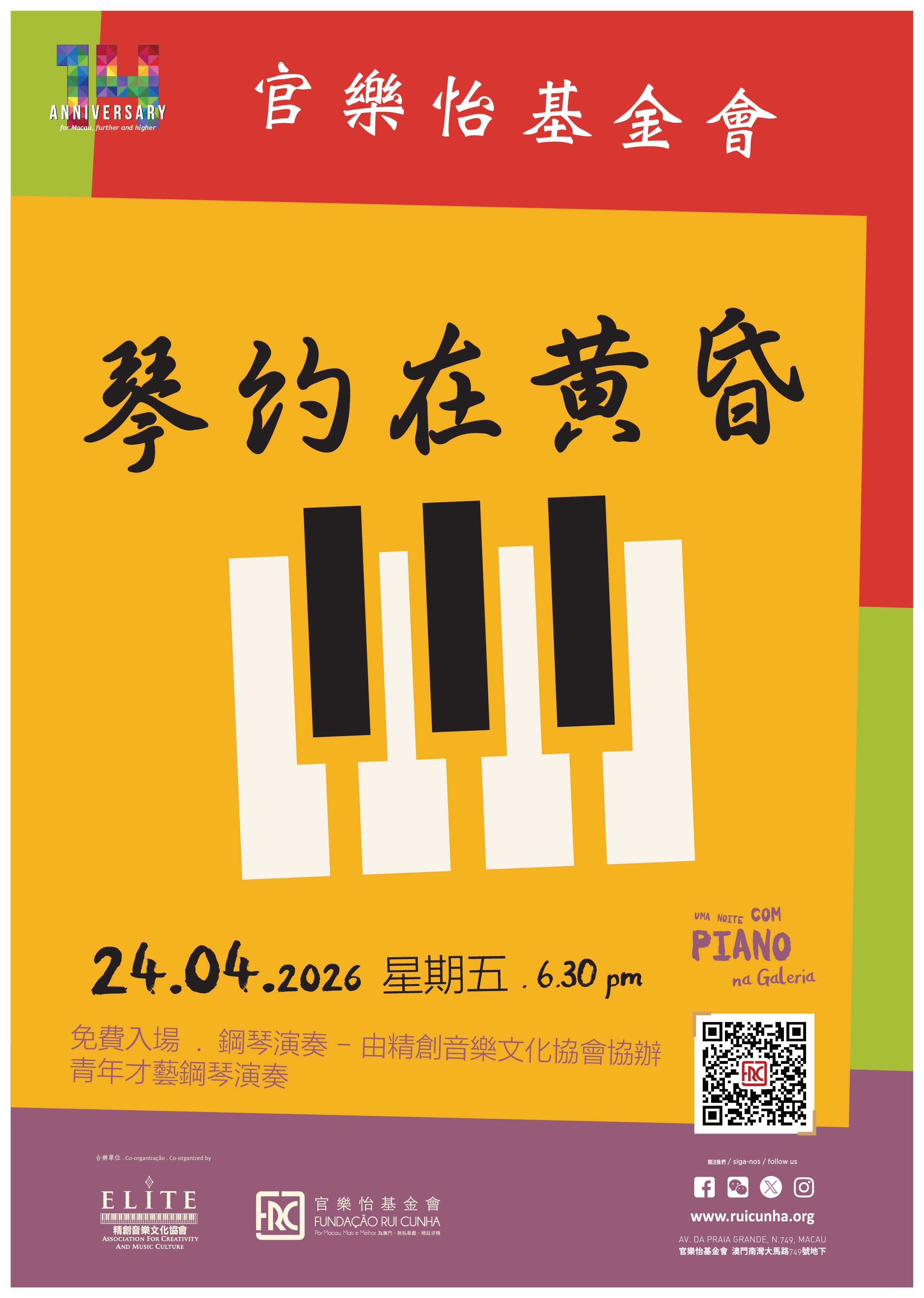琴約在黃昏 – 2026.04.24 活動/發佈會/演講會 No Comment 鋼琴演奏 . 精創音樂文化協會 琴約在黃昏 由官樂怡基金會和精創音樂文化協會協辦之的周五青年才藝鋼琴演奏 今年每月兩次再次啟動。 官樂怡基金會畫廊在二零二四年重新啟動這項音樂活動,讓各個年齡層的小朋友均有機會顯現才能並從公開表演獲取經驗。 是次活動由黎翰澄先生及著名主持人李周麗華女士共同主持。 Share this:LinkedInFacebook