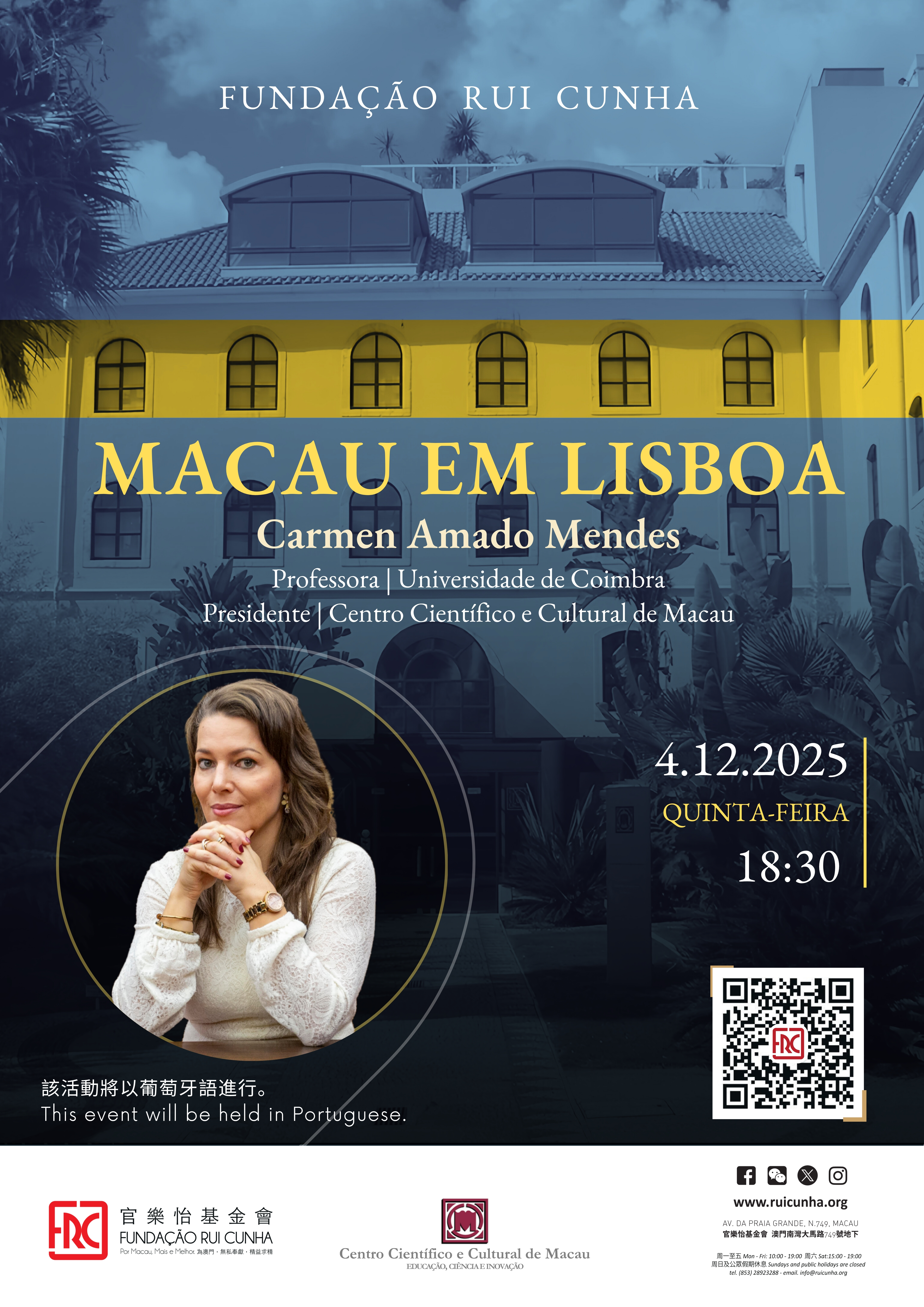 Macau em Lisboa – 2025.12.04 CONFERENCES / DEBATES No Comment Macau em Lisboa Carmen Amado Mendes Professora | Universidade de Coimbra Presidente Centro Científico e Cultural de Macau 4.12.2025, quarta-feira, 18:30, na Fundação Rui Cunha 該活動將以葡萄牙語進行。 This event will be held in Portuguese. Share this:LinkedInFacebook