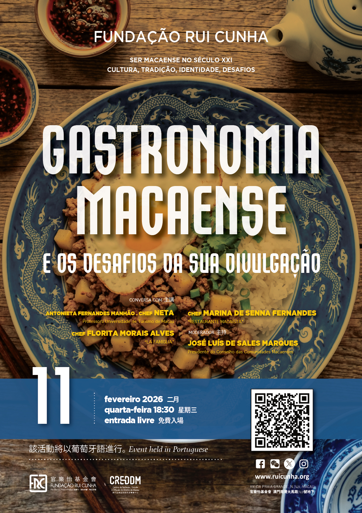 Being a 21st Century Macanese – 2026.02.11 CONFERENCES / DEBATES No Comment Being a 21st Century Macanese “Macanese Gastronomy and the Challenges of its Promotion” Event held in Portuguese 11.02 6:30 pm Rui Cunha Foundation Share this:LinkedInFacebook
