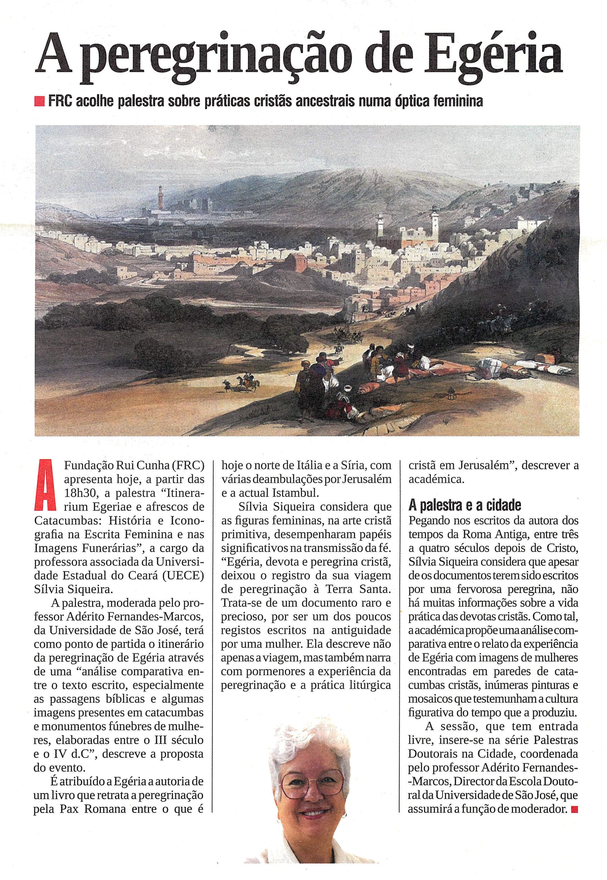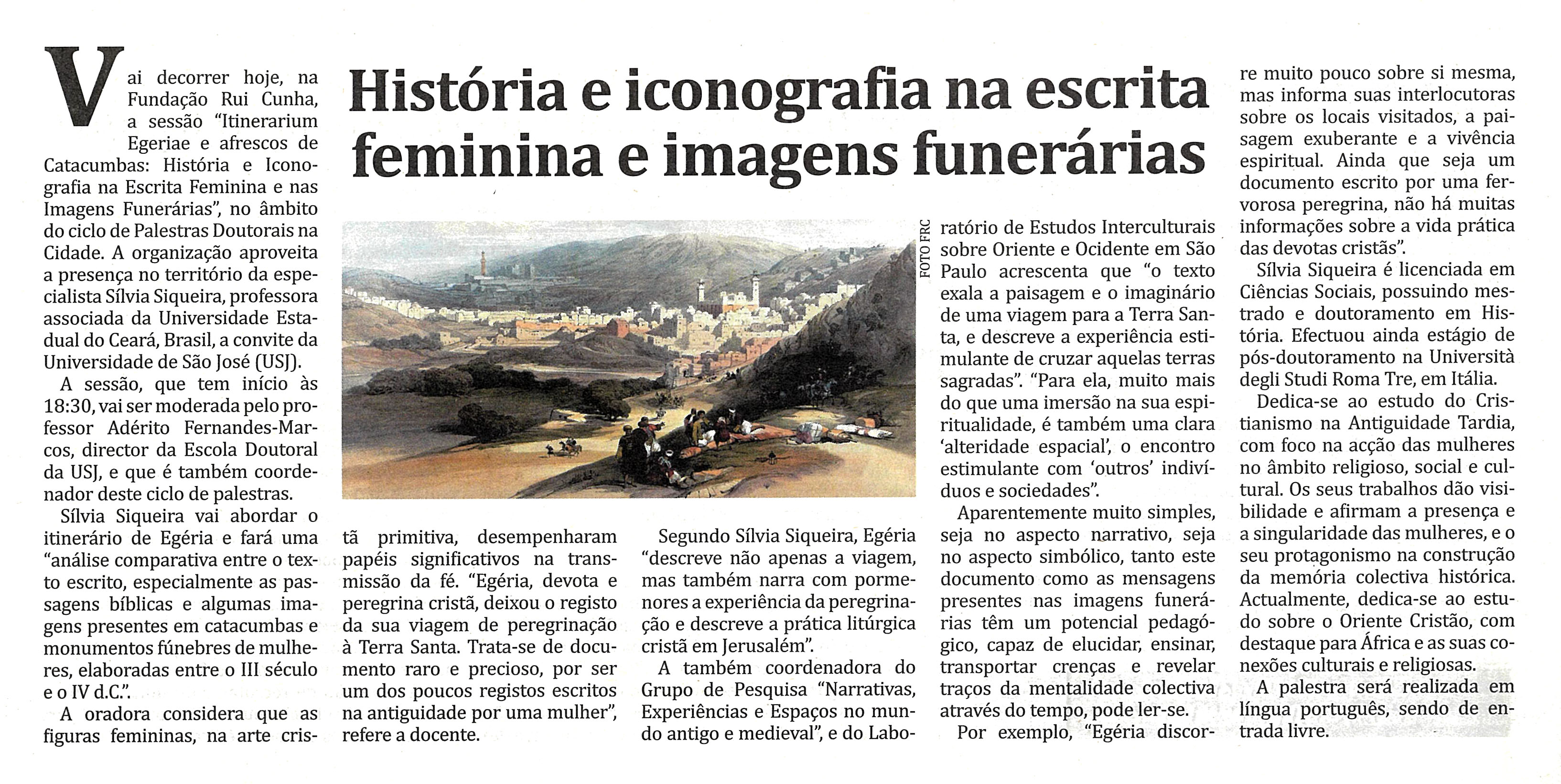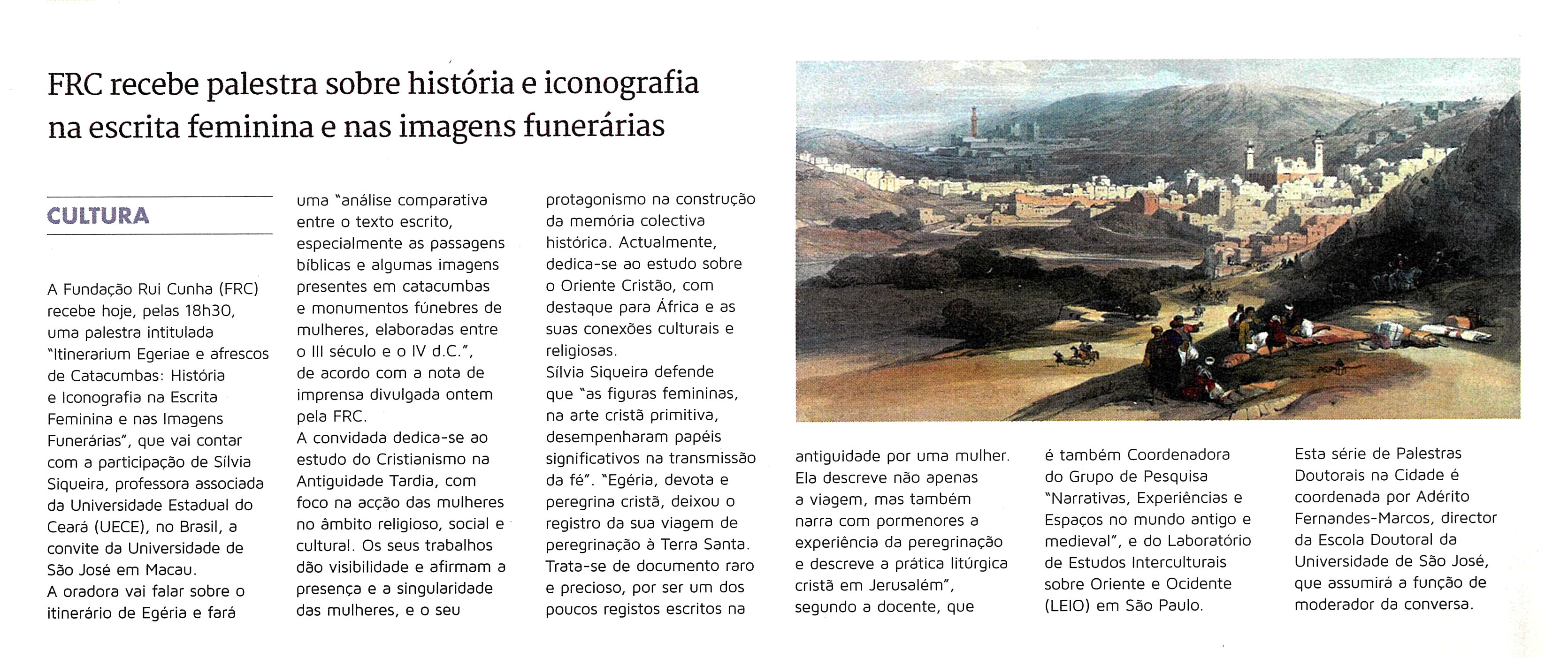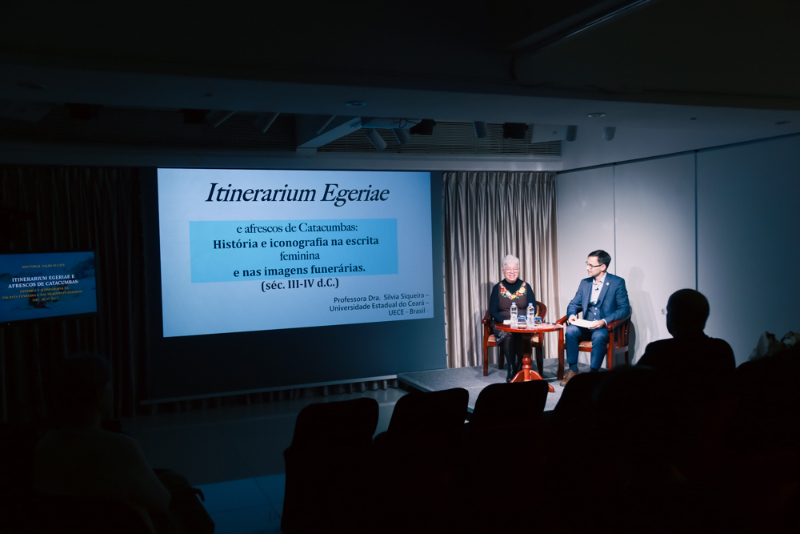 A Fundação Rui Cunha apresenta na quarta-feira, dia 18 de Março às 18:30 horas, uma sessão do ciclo de Palestras Doutorais na Cidade, intitulada “Itinerarium Egeriae e afrescos de Catacumbas: História e Iconografia na Escrita Feminina e nas Imagens Funerárias”, aproveitando a presença no território da especialista Doutora Sílvia Siqueira, Professora Associada da Universidade Estadual do Ceará (UECE), Brasil, a convite da Universidade de São José em Macau.