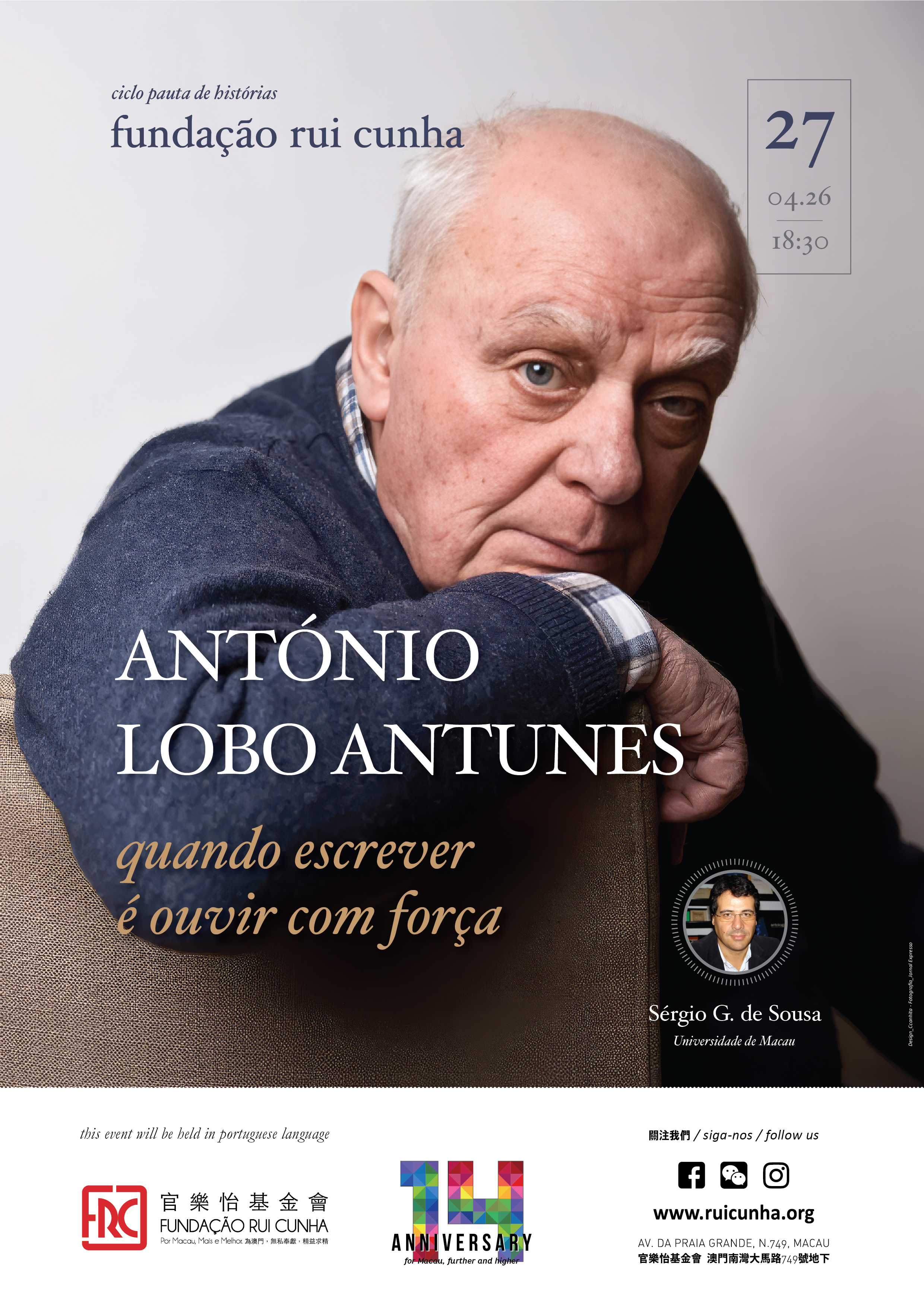 Quando Escrever É Ouvir com Força Notebook of Stories No Comment Ciclo Pauta de Histórias, na Fundação Rui Cunha ANTÓNIO LOBO ANTUNES quando escrever é ouvir com força 2026.04.27 – 18:30 Apresentação de Sérgio G. de Sousa, Universidade de Macau this event will be bell in Portuguese Language Share this:LinkedInFacebook